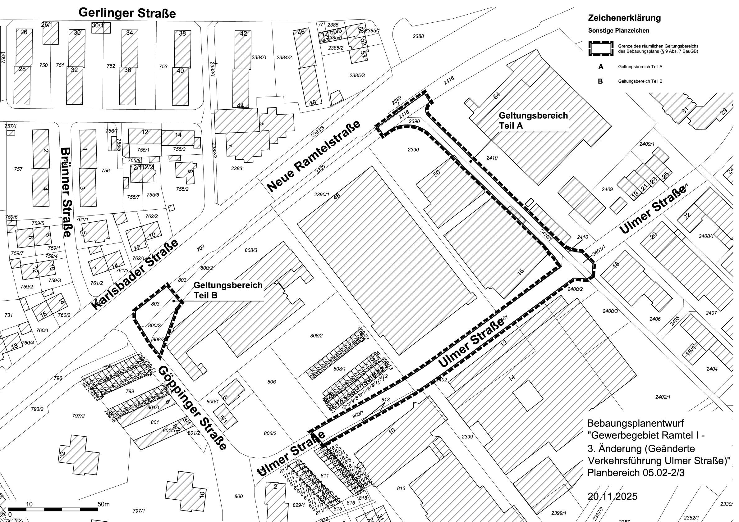 Bebauungsplan „Gewerbegebiet Ramtel I – 3. Änderung (Geänderte Verkehrsführung Ulmer Straße)“, Planbereich 05.02-2/3, in Leonberg