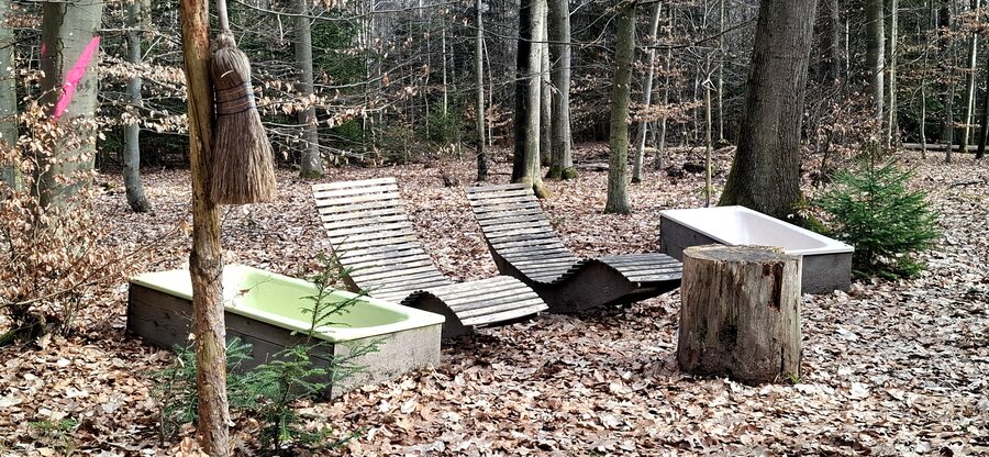 Wir starten in Warmbronn und tauchen bald in den märzengrünen Wald ein. An einem Baumtelefon und einer Blitztanne vorbei, begeben wir uns zum Waldbaden. Dies sind Teile des Natur-Erlebnispfads Magstadt.