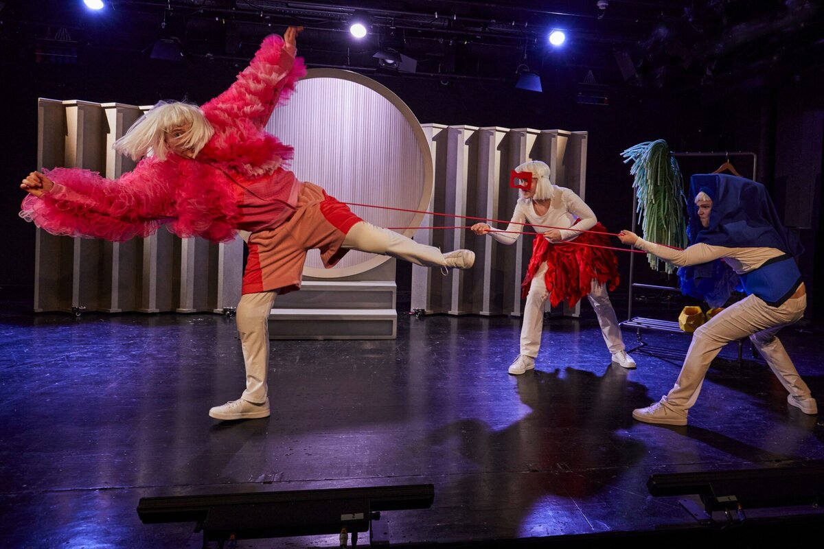 Ein dunkler Raum, dann ein Lichtkreis, und dann plötzlich: Farben. Das Rot, das Gelb, das Blau und das Grün sind neugierig und erkunden den geheimnisvollen Raum aus Licht und Schatten. Jede hält sich für die schönste Farbe und hält daher sicherheitshalber etwas Abstand zu den anderen. Da fällt das Rot plötzlich in das Weiß, und siehe da – das Rosa erscheint. Zuerst ist es zart und leise, verwandelt sich dann aber nach Lust und Laune auch in alle anderen Farben.