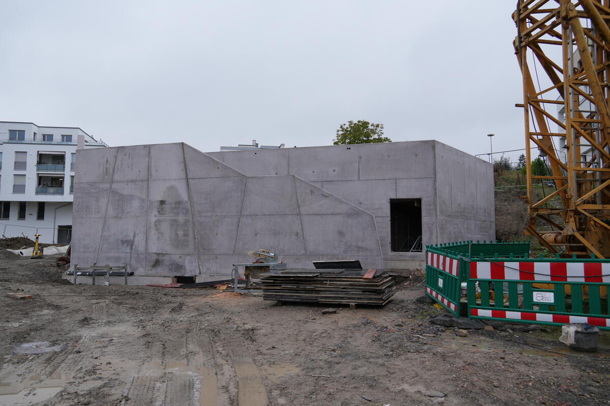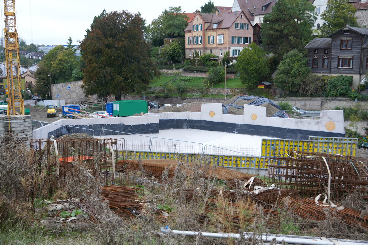 An der Zisterne stehen zwischenzeitlich auch die Wand für einen Treppenabgang und der Raum für die Technikanlage des Wasserbeckens. Sobald auch die Decke der Zisterne ausgehärtet ist, wird die Zisterne testweise für 48 Stunden mit Wasser befüllt. So kann sichergestellt werden, dass sie dicht ist. Parallel wird die sogenannte Z-Mauer geschalt und ebenfalls betoniert. Sie dient als Wand, in die Sitzmöglichkeiten integriert werden.