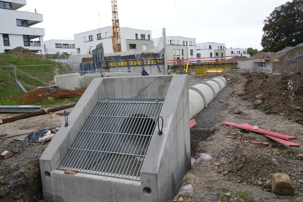 Auch für die Entwässerung des Gebiets wurde vorgesorgt: Ein Starkregenrohr leitet künftig Wassermassen aus dem östlich angrenzenden Areal in das Retentionsbecken, um das Stadtgarten-Gelände und die Straßen zu entlasten.