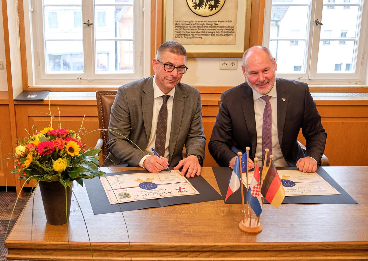 Am Ende der offiziellen Reden sind beide Stadtoberhäupter sichtlich gerührt, denn es ist das letzte gemeinsame Treffen mit allen Leonberger Partnerstädten. Marko Paliaga wird wie Leonbergs Oberbürgermeister nicht erneut kandidieren. Einer der letzten gemeinsamen Akte ist das Unterzeichnen der Jubiläumsurkunde.